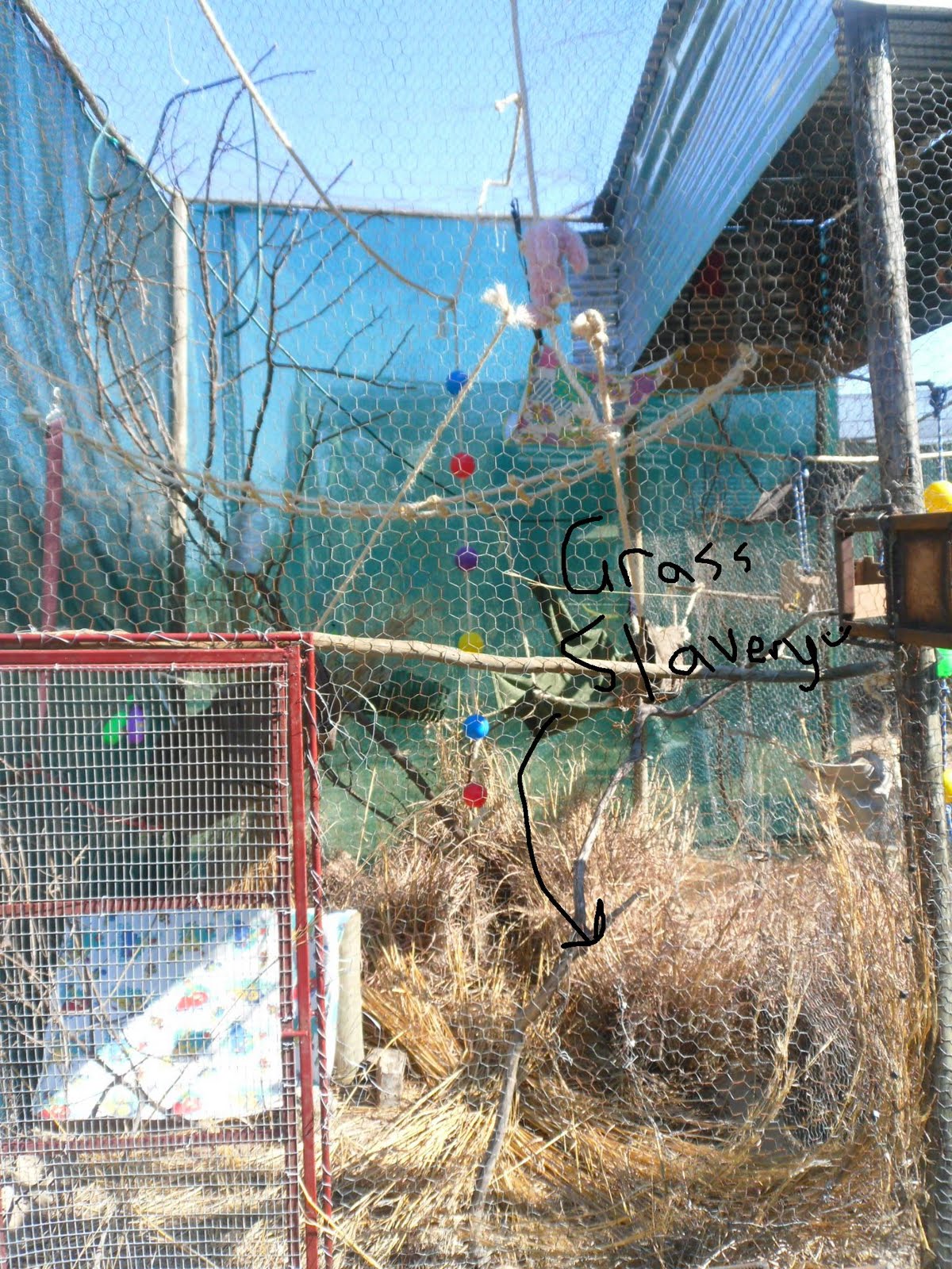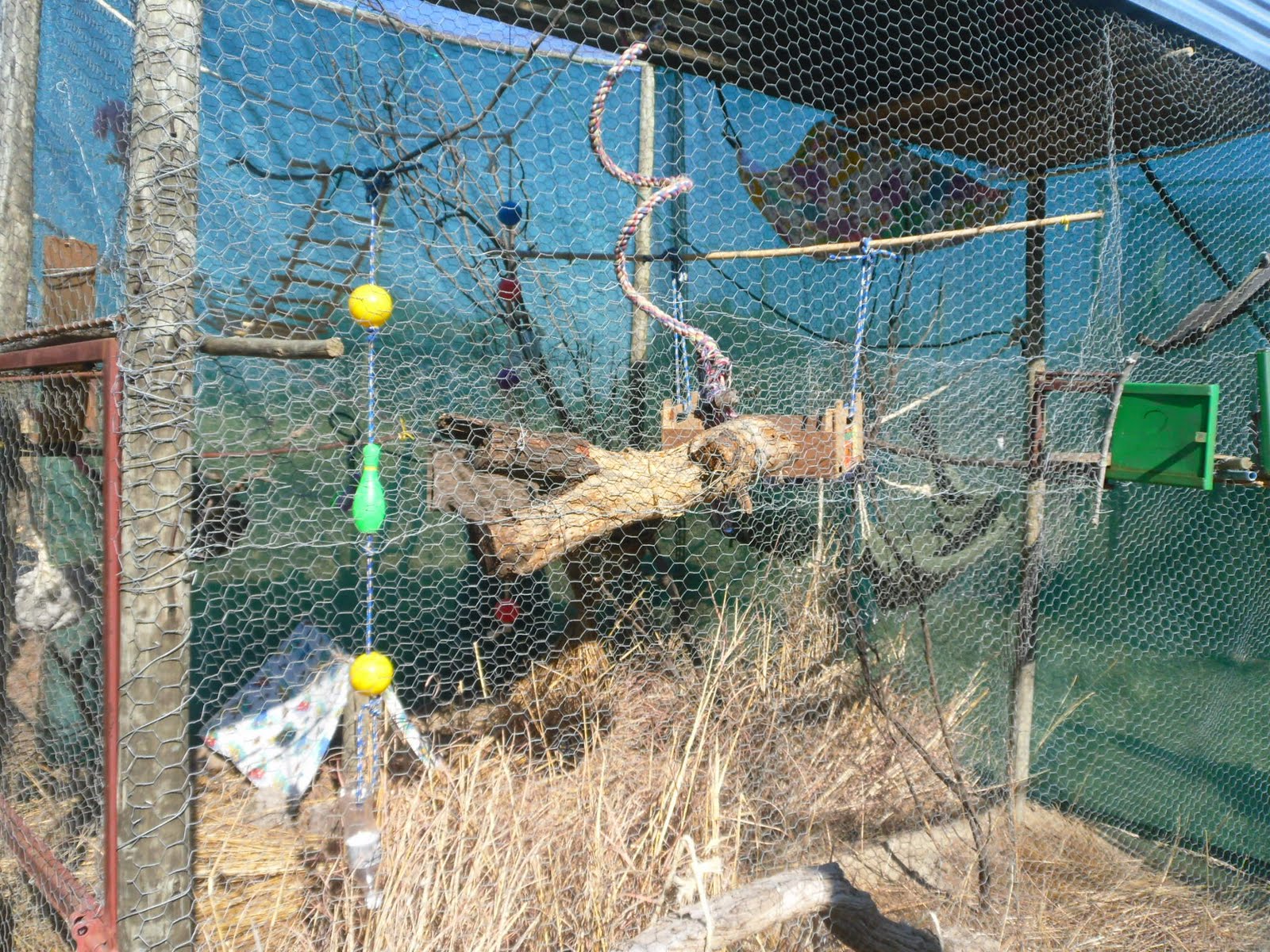 New enclosure with tent, tunnel, hanging hammocks, hanging boxes, branches, ropes, balls/bowling pins and rope ladder.