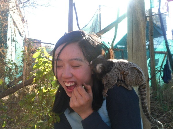 My last monkey time………….went in with the lovely Chimera and Kermit! Chimera kept licking my face (probably the sun-cream) which was extremely ticklish!