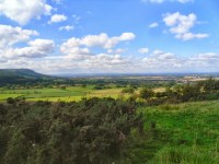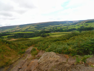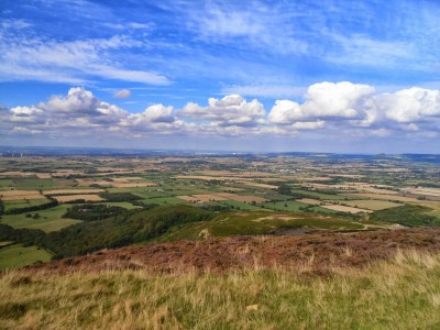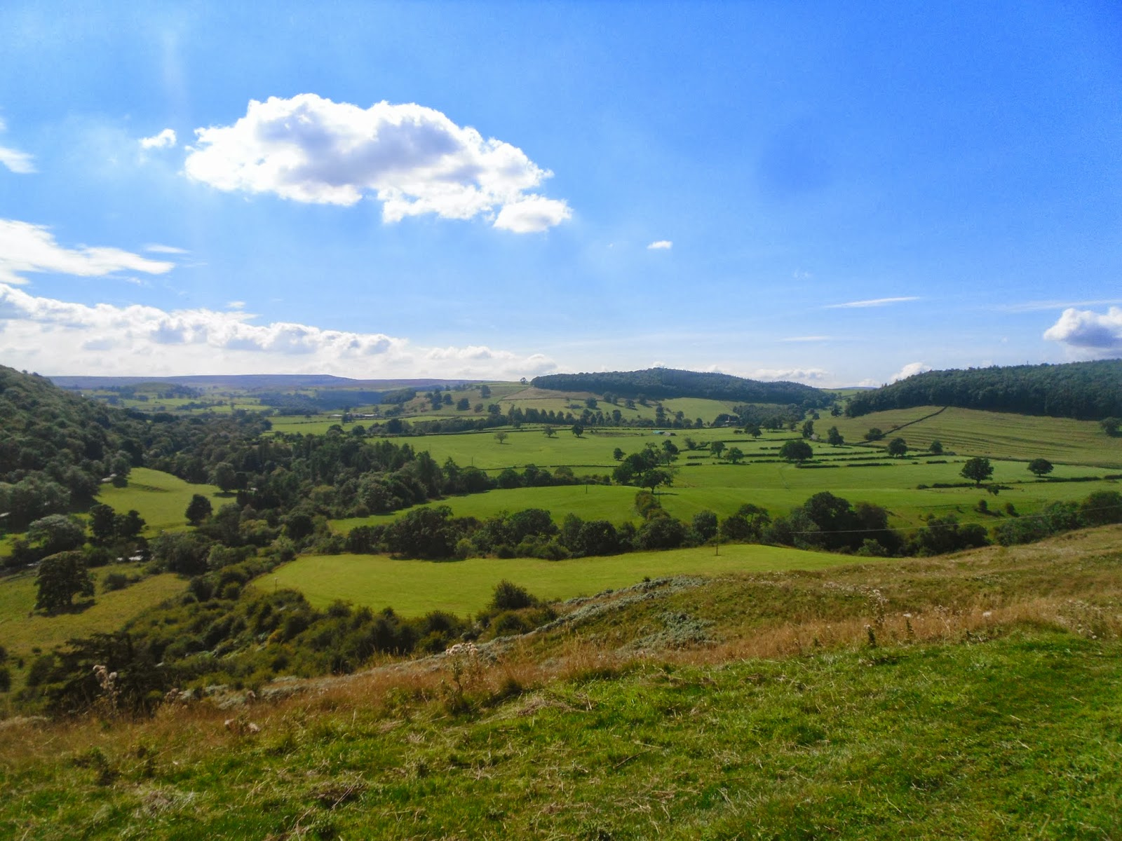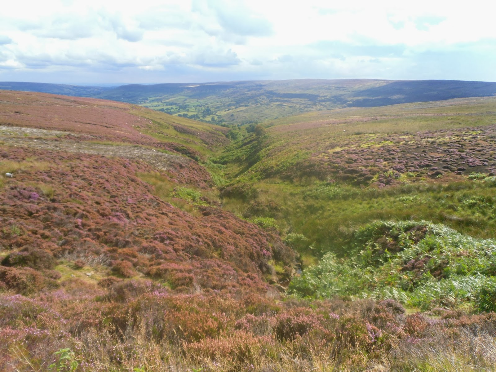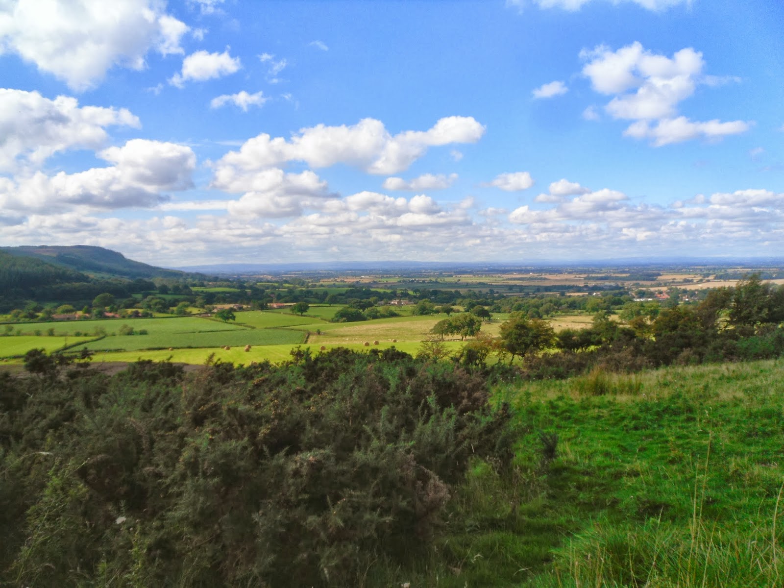 I walk along a disused railway line. It is a flat and easy walk that crosses through the Moors. The view arches into the distance and the scenery consists of a brilliant display of colour: the heathers are a deep purple, contrasted against a patchwork of green hills and soft white clouds.