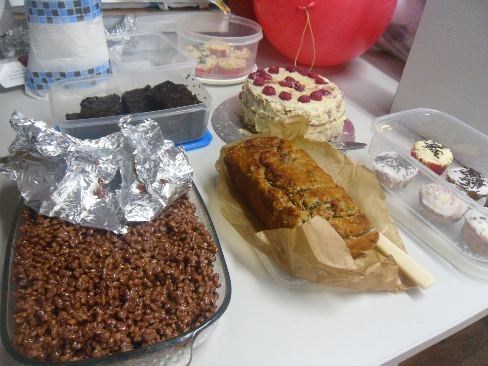 | Chocolate krispy squares, banana cake, cupcakes, chocolate & aubergine cake and white chocolate and raspberry cake (0.50p – £1.00). |