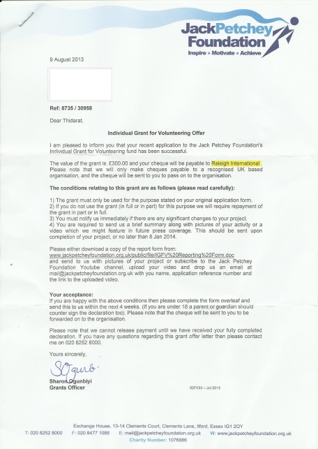 12th June 2013: Today I used a free period at school to google through various grant/charitable organisations for finding sponsorship. I found very few organisations where I fit the criteria for applying for a grant so I’ve got all my eggs in one basket for the Jack Petchey application.