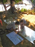The next day, we divide into small groups. We cover house to house surveys in order to produce a final list for the households who were interested in eco-ovens. We gave each family a list of materials they would need to provide for construction. All the ingredients were freely obtainable, for example buckets of water, sand, mud and horse poo!