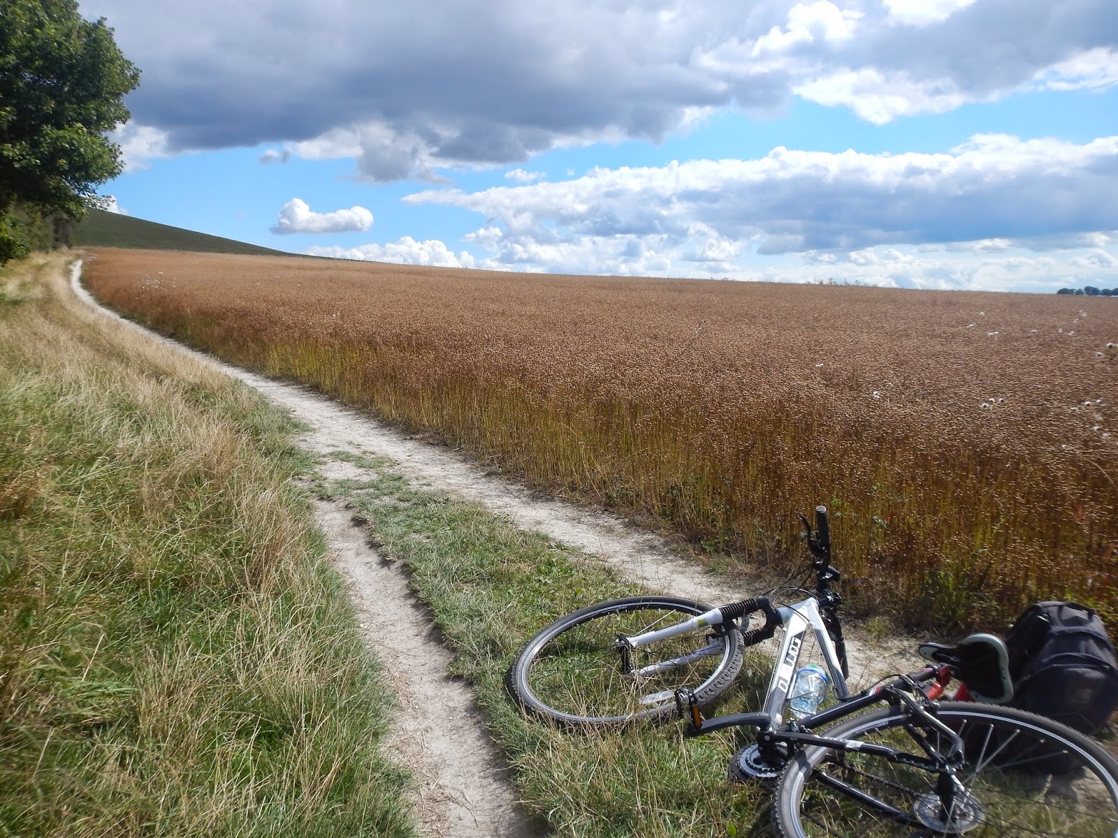 I am cycling on chalk tracks and I didn’t anticipate how much slower this would make me, especially on hills. I cycle downhill but with unease. The uneven terrain was extremely disconcerting. I shudder and rattle with my bicycle, gripping the handlebars hard and as tense as a shell. I do not feel at one with my bike, I feel like I am battling it! I brake constantly to slow down the bumping on downhills and I fight with my pedals on the uphills.