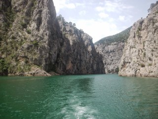 Built in 1984 on Manavgat River, Omyapinar Dam is the concrete mouth of the Green Canyon. The tour leader explains that the freshwater dam has a 300 million cubic metre capacity and it is the 5th largest dam in Turkey. Civilisation feels at bay here. Other then the handful of day trip coaches, the setting is incredibly tranquil. A cerulean sky creates a canvas like background, with the canyon waters a glass clear green rippling gently against boats docked within the quay.