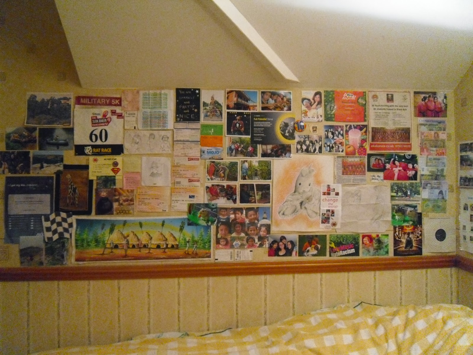 A wall dedicated to everything that I love. I’ve got everything from foreign money/theatre tickets/travel photos/karate pictures stuck on my wall as a reminder to all those little activities we do that bring us joy.