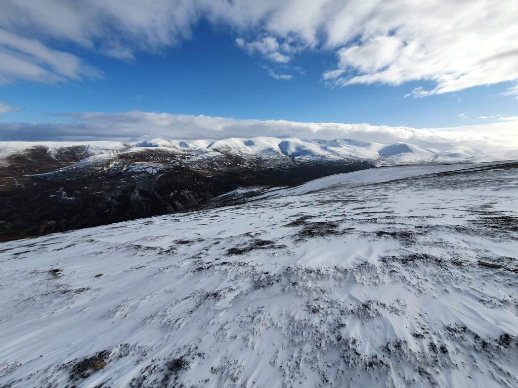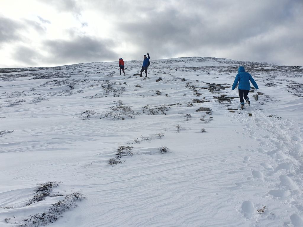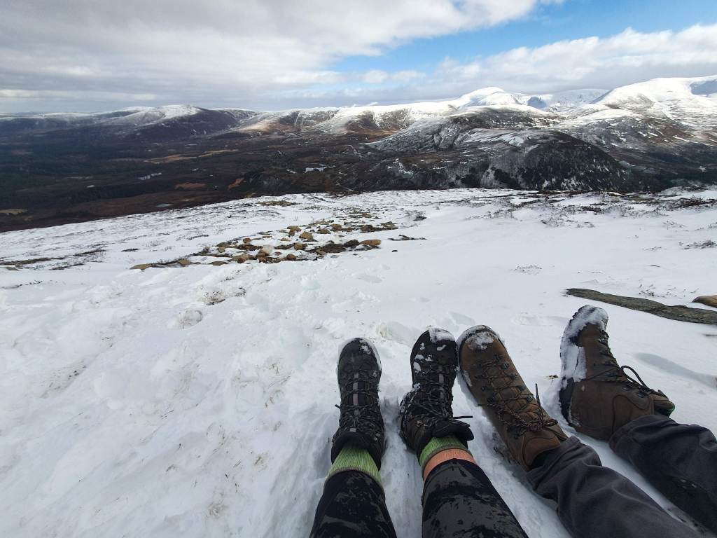 In the afternoon, we ascended up to Meall a’Bhuachaille (810m). With incredible vistas of the Cairngorms in winter, we stayed at the peak as long as we could bear, before a circular descent took us back via the Cairngorm Reindeer Centre.