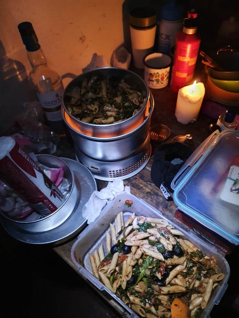 We arrived back at Ryvoan bothy just before darkness settled. There were no other hikers staying the night and together we cooked a olive, mushroom and pesto pasta for dinner. We gazed at the wood-burning stove, our only source of heat as temperatures plummeted below 0°.