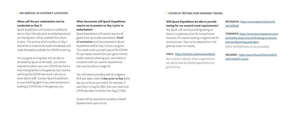 Quark guests are required to carry documentation to show that they are fully vaccinated and you also have to provide proof of a negative PCR test taken within 72 hours of arriving at the airport hotel. The documents are checked by the Expedition Staff on arrival and a further antigen test is conducted at Oslo Airport as well.