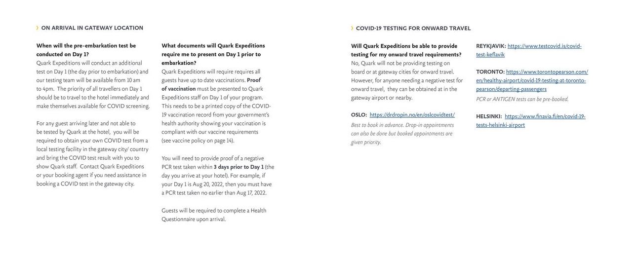 Quark guests are required to carry documentation to show that they are fully vaccinated and you also have to provide proof of a negative PCR test taken within 72 hours of arriving at the airport hotel. The documents are checked by the Expedition Staff on arrival and a further antigen test is conducted at Oslo Airport as well.