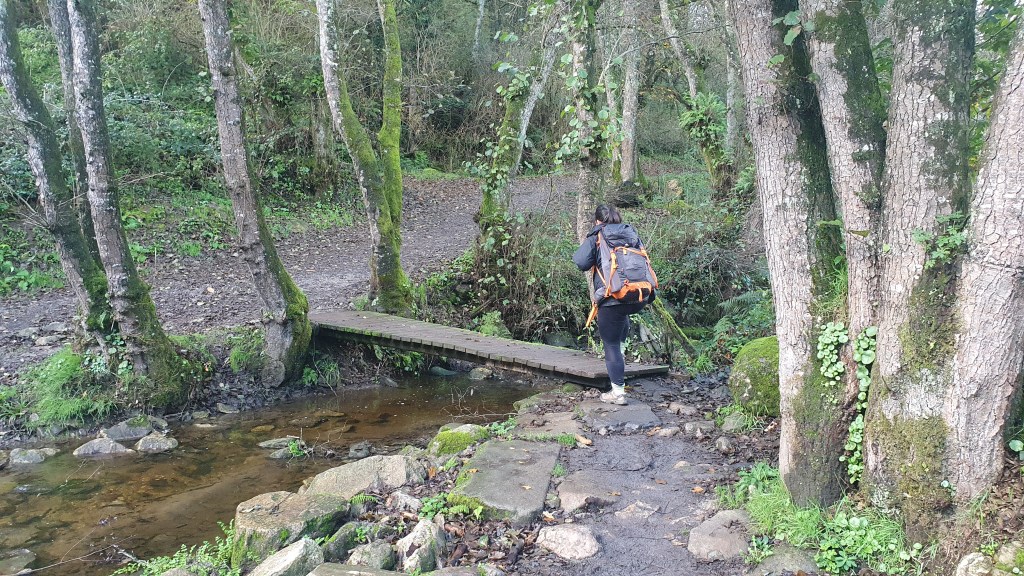 I had a cheap rain jacket on with a hood that was too shallow to contain my ponytail. My left hand was cold, wet and exposed holding the hood over my head the whole time. As I approached a small bridge, I noticed two ladies trekking together, Nuvia and her cousin, two fellow hikers from the Galicia region. They were the very first Peregrinos I met on the Camino trail. I offered to take a photo for her and pressed onwards, once again unaware that the first Peregrinos I met would be the beginnings of a new friendship.