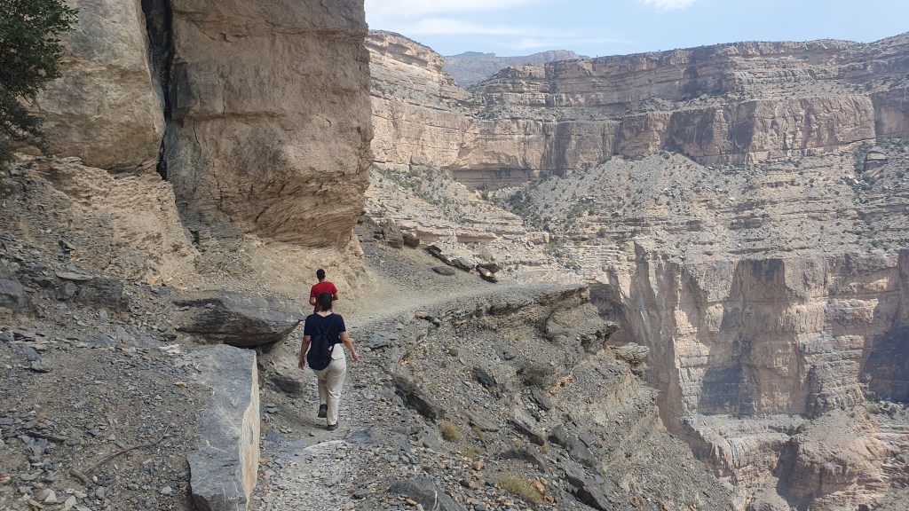 The Jebel Shams/Jebel Akhdar area has stunning views over the Grand Canyon of Arabia from Jebel Shams, the highest mountain in Oman. We had two nights in the mountainous region and loved completing the W6 Balcony Walk (you go back the same way you enter). The walk is about 9km in total and it takes you around the western side of Oman’s ‘Grand Canyon’ offering some of the best views in Oman.