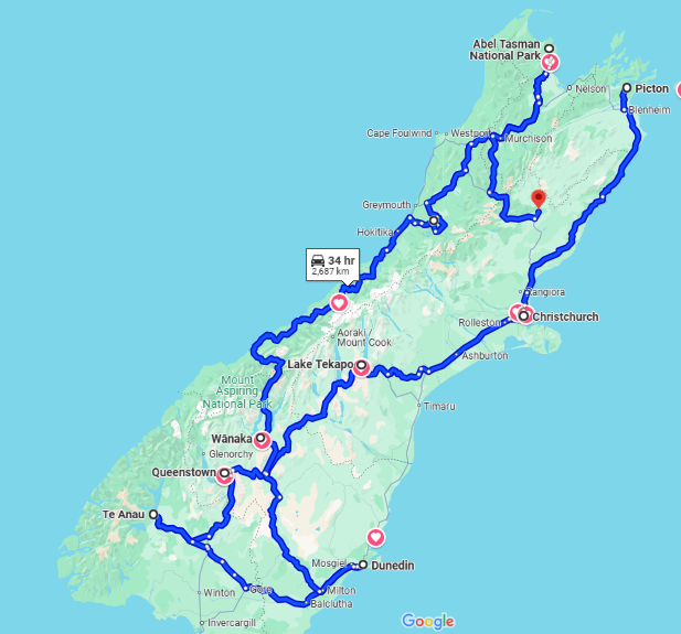 🚗 Christchurch (2) > Lake Tekapo (2) > Queenstown (4) > Te Anau (2) > Dunedin (2) > Wanaka (2) > Franz Josef (2) > Lake Brunner (1) > Abel Tasman (3) > Hamner Springs (2)